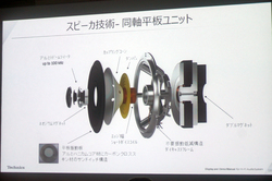 そしてスピーカー「SB-C700」は、同軸平板ユニットを採用。「80年代後半のTechnicsブランドで既に採用していたもの。その頃に培った技術を活かしながら、使う材料などを進化させています。当時はウーファー振動板はアルミだけでしたが、今回はアルミとカーボンクロススキン材を組み合わせたサンドイッチ構造です。トゥイーターは、ドーム形状をシミュレーションで最適化することで100kHzまでの再生を実現しました。またキャビネットはMDF製で、板厚を不均一にすることで余計な共振を低減。ラウンド形状とすることで回折反射を低減しています。
