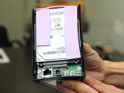 本体は、邪魔にならず部屋の隅に設置できるよう、コンパクトなペットボトルサイズとしている。三角形のデザインを採用し、三点支持とすることで設置時の安定性にも配慮した。内部基板は、ヒートシンクで静音性を高めたファンレス設計。従来モデルでは3.5インチHDDを採用していたが、今回は2.5インチHDDを採用している。これにより、3.5インチ搭載時に10〜15W程度であった消費電力を、本機では8Wに抑え、加えてHDD動作音も低減した。SSDモデルの動作音はほぼ無音になるとしている。