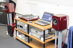 スペックは、糸ドライブ砲金製40cmターンテーブルを採用したアナログターンテーブル「GMP-70」を中心に、SPECブランドのアンプ群、そして同社が取り扱うamphionのスピーカーシステムを使ったデモを行った。