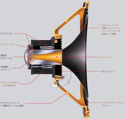 Turnberry/GR LEにおける最大の特徴は、10インチ・デュアルコンセントリックドライバーに「ALCOMAX-III」アルニコマグネットを採用した点だ。ALCOMAX-IIIは、従来のアルニコの3倍の磁気エネルギーを持ち、高い駆動力と解像度、そして他のマグネットでは得がたい音楽的な表現力の豊かさを備えているとのこと。トゥイーター部には上位モデルと同一設計の真鍮削り出しホーンを備えたコンプレッションドライバーを採用している。