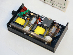 また今回のイベントでは、アンディクス・オーディオ(株)が制作したという、出力トランス搭載の真空管ポタアンも参考出展していた。回路はAB級プッシュプル形式で、出力部に真空管を使用しており、出力トランスも内蔵することによって力強い音質を狙っている。