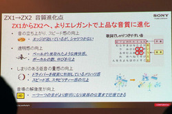 一方、「S-Master」のデメリットとして「歪んだ音源を再生すると、音の立ち上がりが速いので正しく歪んで聞こえる」ことだという。「我々はそれが正しいと思っていたのですが、これってアナログのアンプで聴くと歪まずに聞こえるんですよね。ZX1を開発していたとき『オーディオの世界では歪んだ音源も歪まず聴かせるものだ』と指摘されて。なのでZX2では、ハイスピードなサウンドをキープしたまま歪まないようにしました」(佐藤朝明氏)と、ZX1からZX2のサウンド思想の進化を解説した。一方でNW-ZX2の音を聴かせた音楽制作者の人などからは「ZX1の音の方が好きだった」という声もあったという。