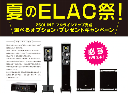 (株)ユキムは、「夏のELAC祭!」と題し、同社が取り扱うELACのスピーカー「260LINE」の購入者全員が対象のオプション・プレゼントキャンペーンを開始した。キャンペーン期間は2015年9月20日まで。