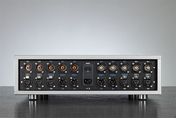 入力にはXLRを3系統、RCAを2系統備え、入力感度は2、4または8V RMS。インピーダンスはXLR、RCAともに10KΩ (RIAAモジュール非搭載時)。