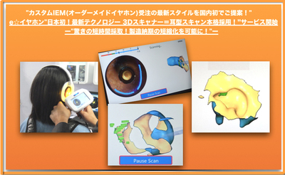 カスタムインイヤーモニター(IEM)を作成するための耳型採取に際して、3Dスキャナーを用いるというサービス。3Dスキャン作業は片耳約5分、両耳で約10分前後で、耳穴に充填剤を注入する従来の方法で約30分前後必要であるのに対して短時間で耳型採取を終えることができる。また、充填剤を用いないのでユーザー自身の身体的・精神的負担も軽減できるとしている。