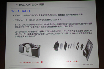 ドームトゥイーターとリボントゥイーターは、EPICONと同形状のプレートにマウントされている。また、ブックシェルフ型OPTICON 2については筐体サイズのコンパクト化を優先してリボントゥイーターの搭載は見送られたが、ドームトゥイーターによる超高音域については再チューニングが施されたとのことだ。