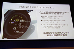 特徴は、φ50mmダイナミックドライバーとφ14mmスーパートゥイーターの2ウェイ構成とし、3Hz〜100kHzまでの再生に対応している点。ダイナミックドライバーの振動板にはAdvanced MLF(マルチ・レイヤー・フィルム)ダイアフラムを採用。パナソニックブランドのハイレゾ対応ヘッドホン「RP-HD10」の振動板とはドーム形状を変えたほか、マット処理とすることでフラットな特性を実現したという。また、トゥイーターにはアルミ振動板を採用した。2つのドライバーは最適な角度に傾けられており、自然な臨場感を実現するという。
