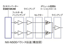 デジタル入力部や後述のUSB-DAC回路は、左chのキャビネットに搭載されており、右ch向けのD/Aコンバーター出力を右chキャビネットにアナログ伝送する構造となる。D/Aコンバーターの出力〜左右パワーアンプ入力間はバランス伝送方式で、左右スピーカーの音質差を最小化してS/Nも向上させた。