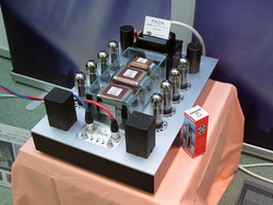 オーロラサウンドは、11月1日の発売を予定している真空管パワーアンプ「PADA(関連ニュース)」をメインにフィーチャーしたデモを実施している。PADAは、真空管とトランジスタを使ったハイブリッド構成のパワーアンプで、出力管はEL34の三極管接続を採用している。