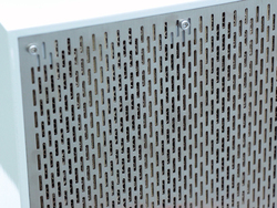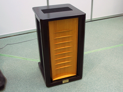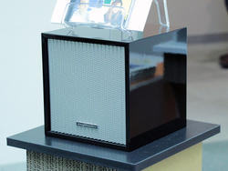 クラフトノーツは、ミニマムなデザインの小型スピーカー「OT-360」をアピール。本機はスピーカービルダー芹川明義氏が手掛けている“オープンスルー方式”のスピーカーで、後面開放型のユニット内部に段ボール製の独自フィルターを設置することで、逆位相音の乱れを制御するという仕組み。これによって再生帯域のエネルギーをフラットに保ち、フロントとリアそれぞれから放射される音の整合を行っている。本機を手掛けている(株)ミヤザワは段ボール製品の販売を行っている会社であり、本スピーカーには自社の段ボールを使用している。