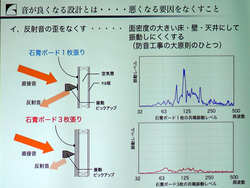 では、そんな部屋づくりのために注意すべきポイントは何なのか。それについては「反射音に余計な周波数特性を与えないこと」だと鈴木氏は説明。防音工事で面密度を上げる(重くする)ことで面振動を抑え、寸法比率の適正化によって定在波を分散させることで、音が良くなると述べた。