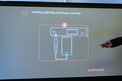 発表会では、すでに日本でも発売済みのUSBフィルター「JITTER BUG」についても紹介。本機の開発も手がけたSteve Silberman氏は、「安価なUSB-DACはもちろん、ハイエンドDACでも、JITTER BUGの効能は得られます」とコメント。本機の開発にあたっては、14個もの試作品が作られたことも明かしてくれた。