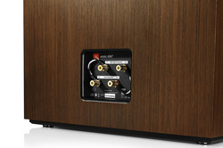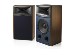 キャビネットはMDFを使用。複数のブレーシングや内部補強によってパネル鳴きを抑え、再生音への影響を防いでいる。外観はウォールナット天然木仕上げにサテン・クリアコートフィニッシュ。フロント部はJBLスタジオモニター伝統のブルーバッフルとなっている。また、キャビネット底面にはベースボードとステンレス製スパイクセットを装着している。
