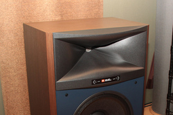 D2デュアルドライバーの性能を引き出すべく、ホーンも「Xウェーブガイド・ホーン」に変更。こちらはJBL独自のHDI (HighDefinitionImaging)技術を用いたもので、リスニングエリアが広く、クロスオーバー周波数(700Hz)まで均一な再生を実現するという。ホーンの素材には上位モデルと同じく高比重・高剛性のSonoGlassを採用。このホーンをバッフル上面に固定することで、キャビネットの剛性を大幅に向上させるとともに、低域および中高域の過渡特性も改善したという。