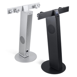 スピーカー部はトゥイーター、ミッドレンジ、ウーファーを各chごとに1基ずつ搭載。T字筐体の上横一列にトゥイーター/ミッドレンジ、縦部にはサイド側に向けてウーファーを配置している。ウーファー部のバスレフポートは背面に備えている。