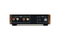 ヘアライン加工を施したアルミ製筺体を採用し、ボリュームノブも削り出しとなる。両サイドには木目調パネルをあしらっている。消費電力は最大2.5W。外形寸法は150W×41H×121Dmm、質量は約700g。