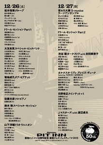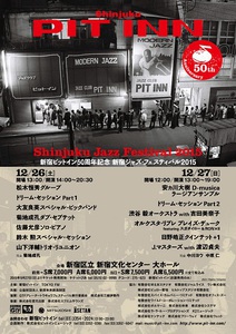 先にもお知らせしたが、本日50周年を迎えた名門ジャズクラブ『新宿ピットイン』。それを記念した音楽祭 『新宿 PIT INN 50周年記念 新宿 ジャズ フェスティバル2015』が、今週末の12月26日と27日に開催される。