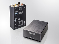 本体のほかに電源供給部を付属するフォノイコライザー。本体サイズ100W×55H×167Dmm、質量0.8kgというコンパクトなサイズを実現している。筐体はアルミニウムブラック仕上げ。