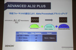 デノン独自のアナログ波形再現技術“Alphaプロセッシング”の最新バージョンとなる「Advanced AL32 Prossesing Plus」もDCD-SX11から継承。44.1/48kHzの入力は16倍、88.2/96kHzの入力は8倍、176.4/192kHzの入力は4倍のオーバーサンプリングで処理を行う。「“Plus”に進化するにあたってはアルゴリズムに修正を加え、自然界に存在するアナログ波形により近いかたちに補間できるようになりました」(出口氏)。