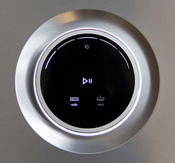 本体上部には、ネットワークや周辺機器との接続設定・再生/選曲スキップ・ボリュームの調整など基本操作ができる円形のパネルを備える。また、本機はグリルを交換することが可能となっており、ブルー/オレンジ/レッドの3色をオプションとして発売する予定。詳細は後日発表とのことだ。