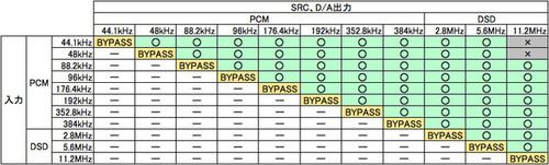 アップサンプリングの仕様は、PCM 44.1/48kHzをDSD 5.6MHzまで、PCM 88.2/96/176.4/192/352.8/384kHzをDSD 11.2MHzまで、DSD 2.8/5.6MHzをDSD 11.2MHzまでアップサンプリングできる。なお、例えば192kHz音源を44.1kHz音源へ変換するといったような、ダウンコンバート機能には対応していない。そのほか、選択できるサンプリングレート/フォーマットには一部制限がある。詳しくは以下の「SRCモード対応表」を参照のこと。