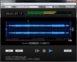 TASCAM Hi-Res Editorは、2chまでのDSD/PCMのハイレゾファイル編集が可能なソフトウェア。DSDは 11.2MHz、PCMは384kHz/32bitに対応し、DSD/PCM相互のファイル変換やサンプリング周波数などの変換、ファイルの分割、結合といった基本的な編集、イン/アウト点で指定した区間の変換/書き出しなどを行える。DSDのままインポート・編集を行うことも可能だ。