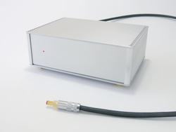 筐体はヘアライン仕上げ。エンクロージャーには、放熱性の高いアルミ使用している。本体サイズは180W×62H×130Dmm(DC出力ケーブル含まず)で、ケーブル長は1.0m。なお、ケーブル長は50cm〜1.5mまでの間で変更可能(¥324/税込)となっている。