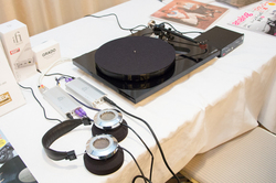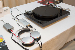 ブースには、iFI-AudioやM2TECHのフォノイコライザーやハイエンドヘッドホンも手がけるGRADOのカートリッジをはじめ、REGAやラックスマンのアナログプレーヤーも登場。GRADOやKINGSOUNDなどのヘッドホンでアナログレコードならではのサウンドを堪能することができた。