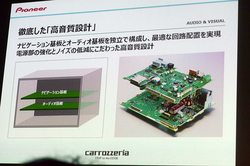 AV機能では、オーディオ基板とカーナビ基板を独立構成にしてノイズを徹底排除。基板上の信号伝送や電源供給パターンを最適化している。オーディオパーツは「高性能48bitデュアルコアDSP」など厳選された高音質パーツを採用。スピーカー用に自然な音のつながりを実現する調整用の「ネットワークモード」を用意している。音楽ストリーミング機能「ミュージッククルーズチャンネル」には、場所や時間帯に応じたチャンネルをレコメンドする「ライブレコメンド」や、スマートフォン内の楽曲も再生できる「MCCライブラリーモード」などの新規機能が追加された。