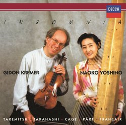 「Insomnia(眠れない夜)」は、ギドン・クレーメルと吉野直子のデュオ・アルバムという珍しい作品。エリック・サティの楽曲を武満徹が編曲した「劇音楽《星たちの息子》から第1幕への前奏曲」から「ゴッドファーザー」のテーマ曲など、幅広い音楽を取り上げている。1996年に録音された貴重な録音だ。