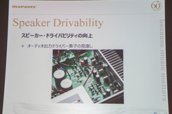 尾形氏は、マランツがアンプ開発において瞬時電流供給能力を重視する理由も説明。「同グループ内でB&Wのスピーカーの輸入も行っていますが、初代800シリーズが登場した際、B&Wに“どのようなアンプでドライブするのが理想的なのか”問い合わせたのです。B&Wの回答は“アンプの瞬時電流供給を大きくしてください”というものでした。以来、マランツのアンプにおいては常に瞬時電流供給能力を意識しています」と述べた。