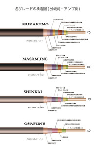 MASAMUNEは、同社のノウハウを詰め込み、様々なシステムで使用できるよう調整したリファレンスモデル。ケーブル構成は、メイン部分に11層円筒構造、分岐後に8層円筒構造を採用。その他はMURAKUMOと同様で、遮蔽はメイン部分が広帯域非磁性特殊積層電磁波吸収材/多種防振材/多種特殊素材/絶縁材で、分岐後が広帯域非磁性特殊積層電磁波吸収材(適材配置)/多種防振材/多種特殊素材/絶縁材。入力側プラグ部は、カーボンステンレスφ6.3mm標準ステレオとなっている。