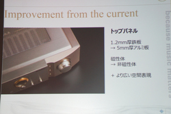 この5mm厚アルミトップパネルは、旗艦アンプ「PM-11S3」でも用いられている。また、非磁性体のトップパネルを用いることで、開発中にトップパネルを外して再生するときのような、開放的なサウンドが実現できるとも説明された。