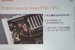 プリメインアンプ「PM-14S1SE」では、音質の要となるパワーアンプ用のブロックコンデンサーを変更。通常モデルでは15000μFという容量のニチコン製ブロックコンデンサーを2基搭載するが、本機では同じくニチコン製ながら容量をアップ。20000μFのブロックコンデンサーを2基搭載した。これにより内部抵抗が低くなり、よりハイスピードかつリニアなスピーカードライブが可能になったとのこと。この点について澤田氏は、「この部品のコストは通常モデルの倍以上です」と紹介していた。
