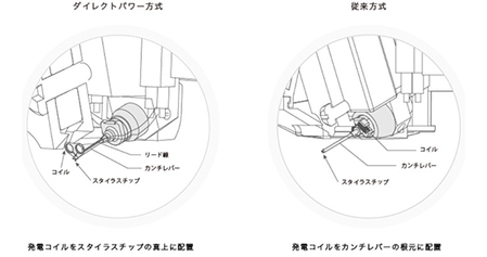 本製品は、発電コイルをスタイラスチップの真上に配置する、独自のダイレクトパワー方式を採用。発電コイルをカンチレバーの根元に配置する従来方式と比べ、カンチレバーの長さや材質に起因する音質への影響を抑制することができるとしている。理論上は理想的な設計とされてきた手法だが、生産技術が難しく、これまで量産は不可能とされてきた。
