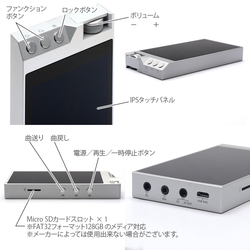 最大DSD 5.6MHz(DIFF/DSF/ISO)までの再生に対応し、ヘッドホン出力として3.5mm 3極と2.5mm 4極バランス出力(先端からR- R+/L+ L-)を装備。そのほか端子類にはラインアウト/コアキシャル出力(兼用)とUSB(マイクロB)を備えている。内蔵メモリーは16GBで、128GBまでのmicroSDカードも使用可能。そのほか3.5インチのタッチパネルディスプレイを備えている。