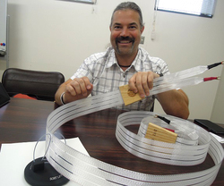 もうひとつのトピックスが、写真の製品。この謎の物体のモデル名は「Sort Lift」。ノードストのフラット型スピーカーケーブルの設置用に開発されたケーブルインシュレーターだ。