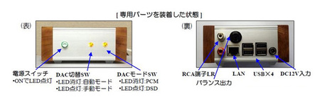 前面パネルには、電源スイッチとDAC切替スイッチおよびDACモードスイッチを配置可能。背面パネルには、RCA端子、バランス出力、DC12V入力、LAN端子用およびUSBポート×4を配置できるようになっている。