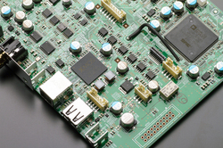 MMM-Streamは、アナログデバイセズ製のDSP「SHARC」を2基、日本アルテラ製のCPLD(Complex Programmable Logic Device)を2基、合計4基のデバイスを用いて処理を行う。その後段のMMM-Conversionは、出力抵抗やコンデンサーでアナログFIRフィルターを構成。出力抵抗にはVishay製のメルフ抵抗を採用するなど、音質パーツも厳選した。