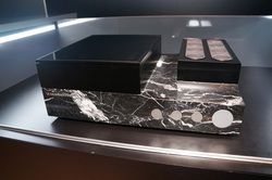 アンプのベース素材にはイタリアのカラーラで産出した美しい模様を特徴とする大理石が採用される。これまでゼンハイザーのメインビジュアル、あるいは日本国内でのリスニングイベント等で登場してきたHE-1は白い大理石を使っていたが、今回IFA2016の会場で展示・試聴デモを行っていたHE-1のボディはブラックだった。