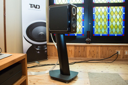 専用スピーカースタンド「TAD-ST3」は、支柱をスラントさせることで、スピーカー周りの反射や回折を低減。ベースには非常の高さと強度に優れる鋼板を使用して、高剛性と低重心化を図っている。