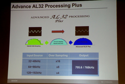 デノンのアナログ波形再現技術“αプロセッシング”は、従来の「Advanced AL32 Processing」から、「Advanced AL32 Processing Plus」へと進化。48kHzは16倍、96kHzは8倍、192kHzは4倍にアップサンプリングし768kHzで出力して処理を行うことで、原音に近い補間処理を行うことができるとする。