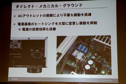 制振構造については、デノンの設計思想「ダイレクト・メカニカル・グランド」をさらに押し進め、ACアウトレットの排除による不要振動の低減、電源基板のヒートシンクを大型化して振動を抑制、電源部の放熱効率も改善するといった対策が実施された。