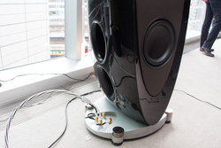 スピーカーの前後を楕円で囲むバッフル、ベース部には、ブロック材から機械加工によって削り出されたアルミが用いられている、結果、1本あたりの重量は140キロにもなるという。楕円形のサイドパネルの表面仕上げは、銘木、カーボン、レザー等の中からユーザーが選択できる。