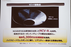ウーファーには、NCV-R振動板を採用。NCVとは、CSCNT(カップ積層型カーボンナノチューブ)と複数の樹脂を配合した素材で、三菱電機と(株)GSIクレオスが共同開発したもの。本機では、カーボンナノチューブの製法を最適化することでさらなる高性能化を図ったNCV-R素材を用いることで、毎秒6,300mという伝搬速度を実現した。