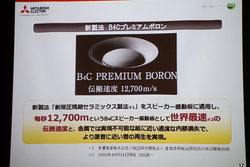 トゥイーターに採用されたB4Cプレミアムボロン振動板は、新製法の新常圧焼結セラミック製法と高度な機械シミュレーションにより、口径と形状を最適化。B4C振動板として世界最速という毎秒12,700mの伝搬速度を達成したという。B4Cプレミアムボロンは、紙に近い適度な内部損失を持つことも特徴で、これにより原音に近い再生音を可能だという。