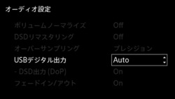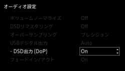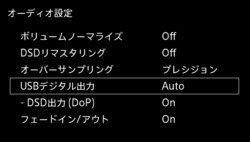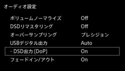 USBデジタル出力については、DSDはDoP出力のみに対応。ホームメニューの「設定」>「オーディオ設定」に「USBデジタル出力-DSD出力(DoP)」というメニューが新たに追加される。本機能はオンオフを選択できる。