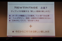 NEW VINTAGEという言葉は、ティアックが提案する“新しい音楽の楽しみ方”を示すと同氏。具体的には「オーディオ機器としての基本である音の良さ」「良いデザインや技術は継承され価値を失わない」「日本のモノづくりにこだわる」という3つの基本理念をベースに、今だからこその新しい楽しみ方を提供していく。