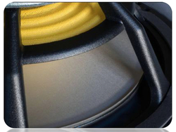 チタン製ボイスコイルと最適化されたサスペンションがマグネットシステムを高能率化し、剛性なピストン動作のために、補強されたエッジを振動板の外端に一体化。最低周波数帯域までパワフルかつ軽やかな再生を実現したとしている。