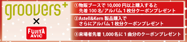来場者1,000名(ほぼ全員に近い)に、grooversでハイレゾ音源を1曲無料ダウンロードできるチケットを配布。会場販売コーナーで10,000円以上購入した来場者先着100名には、grooversとフジヤエービックがセレクトした50タイトルのアルバムから1枚分を無料プレゼント。さらにAstell&Kern主要製品購入者先着100名にはもう1枚分が追加。